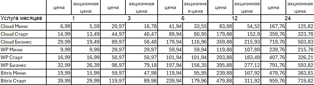 Перечисленные выше акционные цены применяются к тарифам ценам, указанным в Приложении 2 к Договору на оказание услуг хостинга. К акционным ценам не применяются скидки и акции, которые проводятся ООО “Суппорт чейн”.